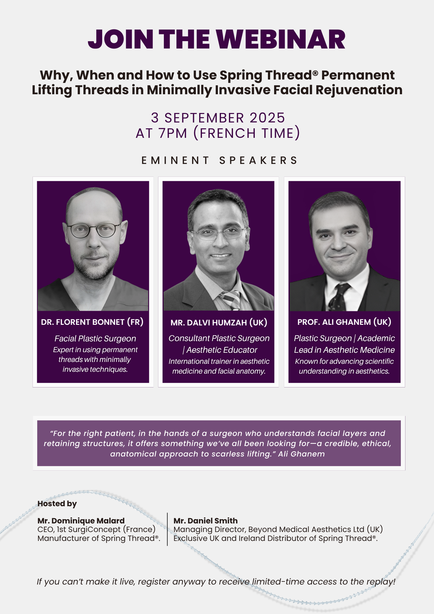 Webinar exclusif – “Pourquoi, Quand et Comment utiliser les fils permanents Spring Thread® dans le rajeunissement facial mini-invasif”, qui se tiendra le 3 septembre 2025 à 19h (le Webinar sera en anglais).